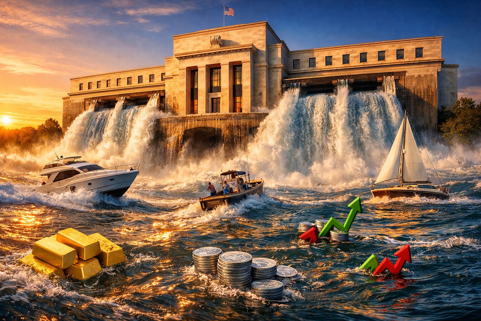 The same thing happens in markets. When the Fed pumps more money into the financial system, asset prices tend to rise. Stocks go up. Gold goes up. Silver goes up. Not because companies suddenly became more valuable overnight, but because there's more money chasing the same investments.